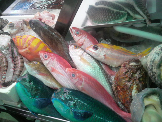 こうせつ市場へ行き、北海道じゃまずみられないカラフルな魚達をみる